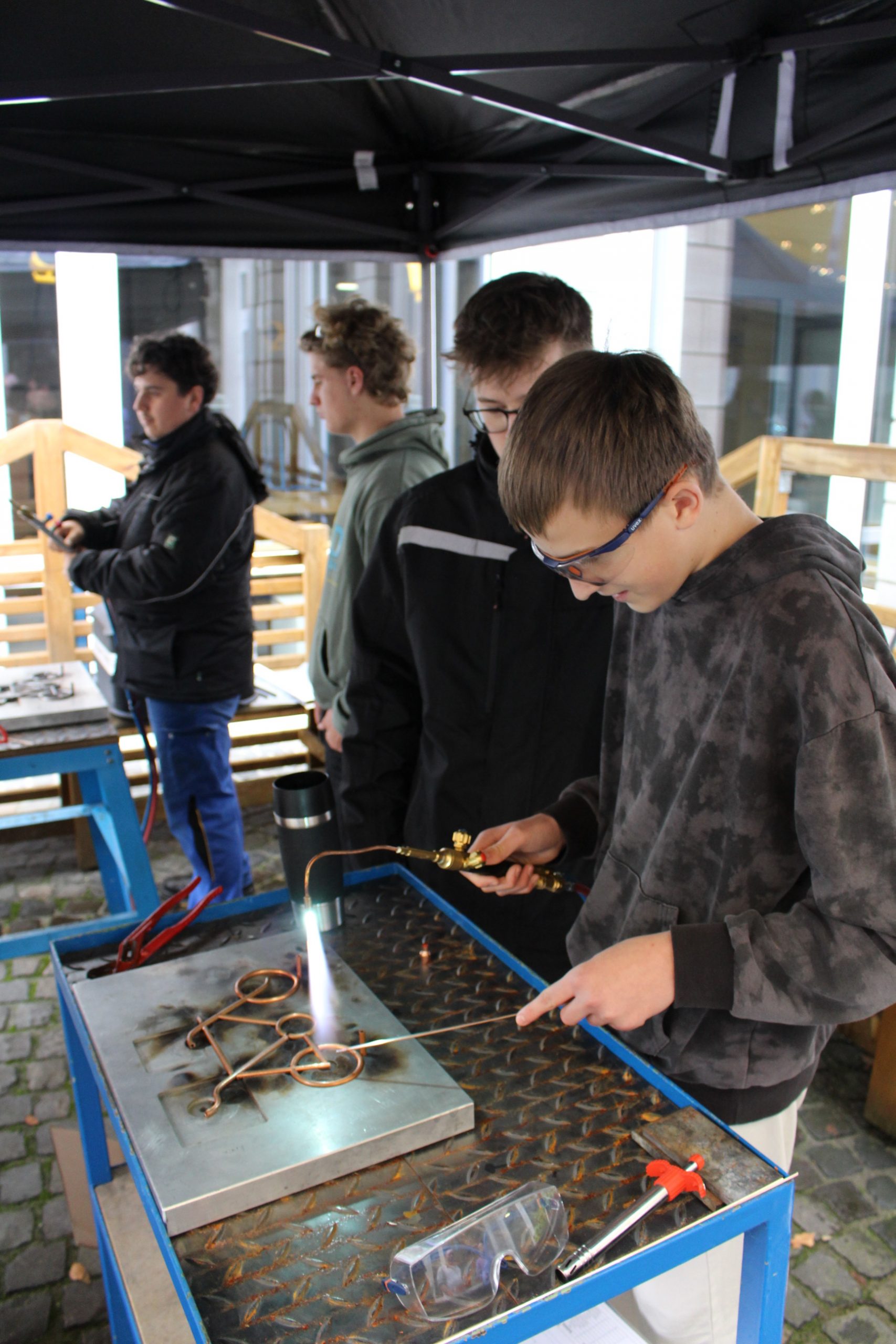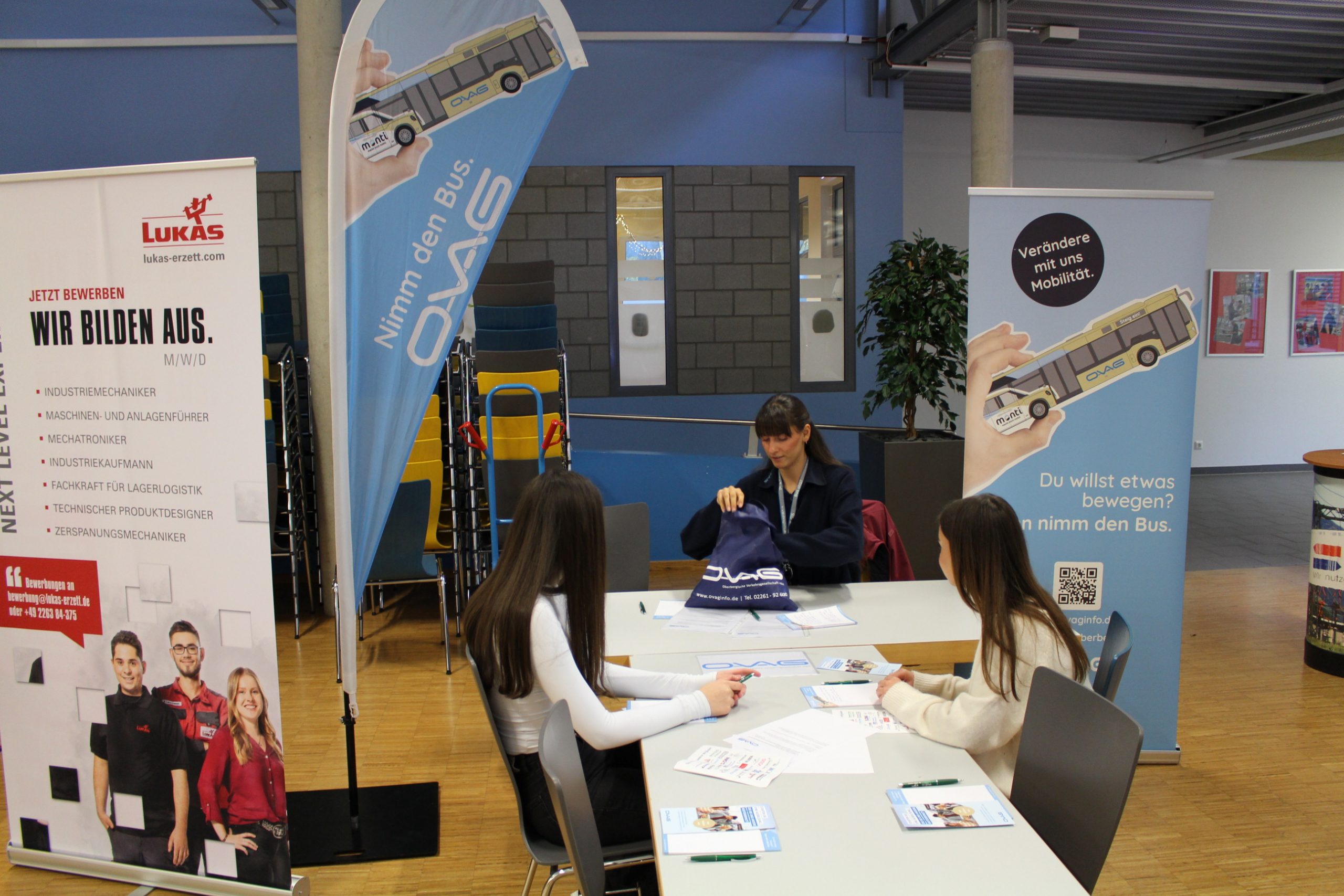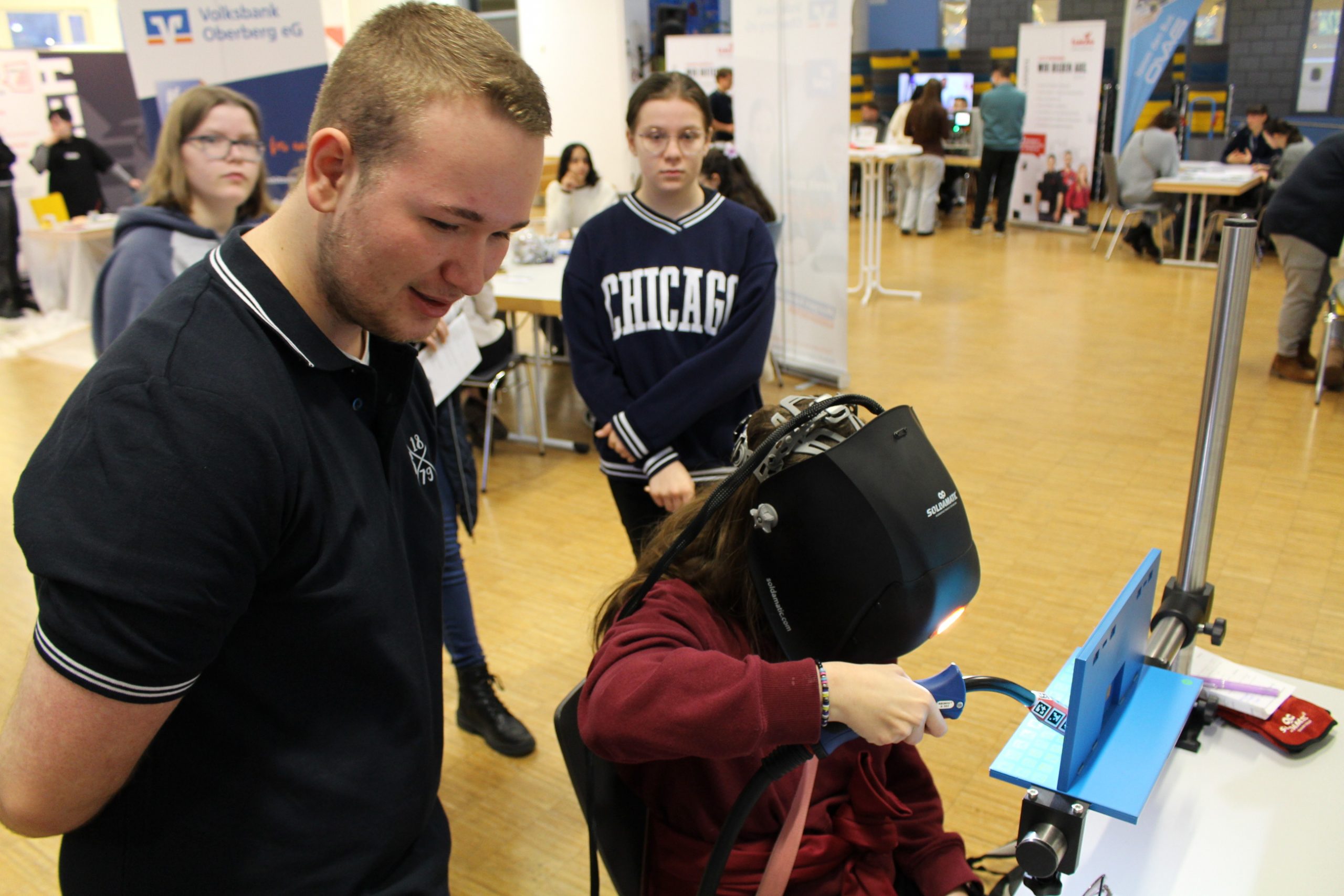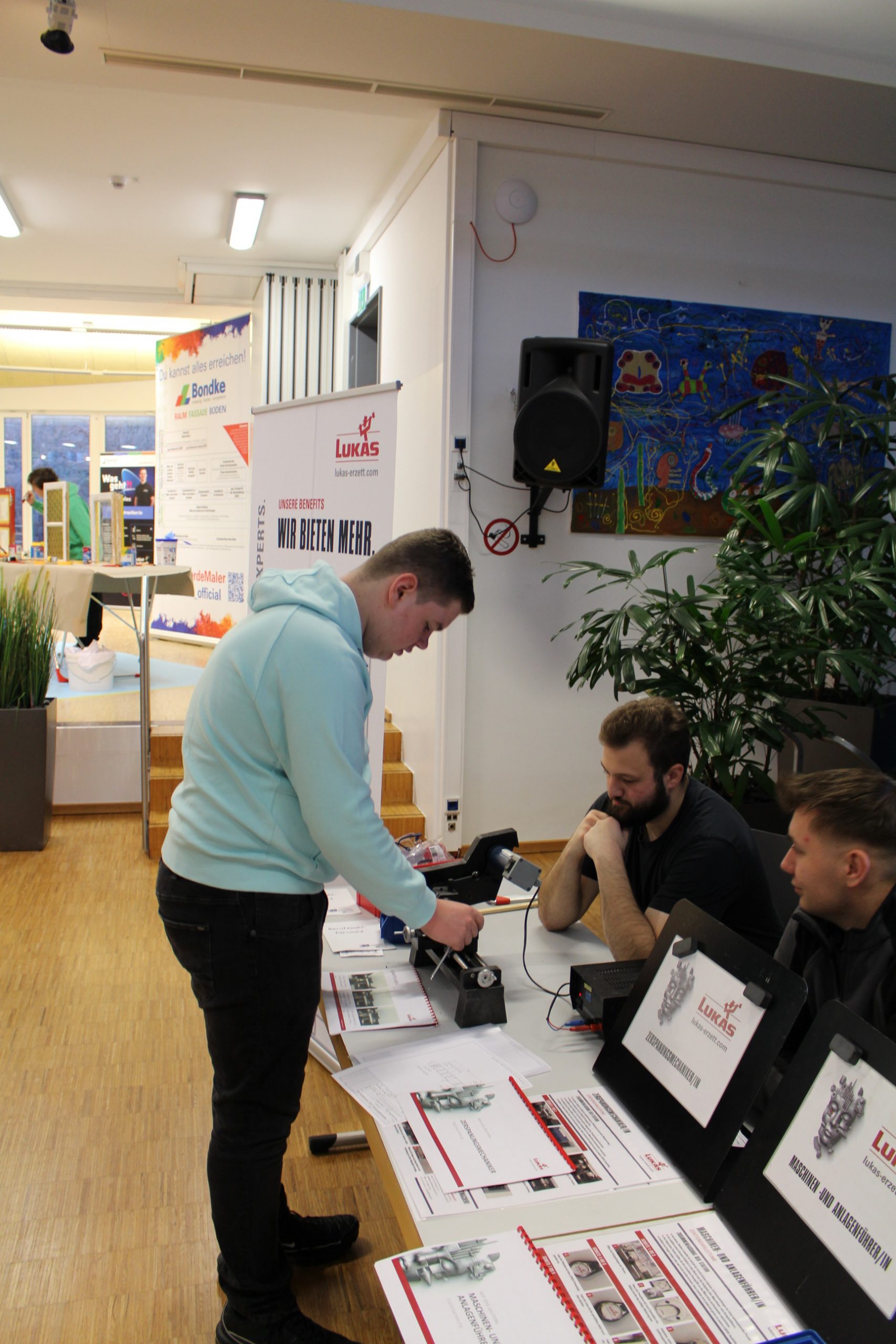 Am Dienstag zischte und hämmerte es in unserer Mensa. Zwölf Betriebe, z.B. aus der Gemeinde H&K Müller und Lukas Erzett und aus der Region, z.B. ONI, Schmidt&Clemens, Volksbank Oberberg, OVAG hatten interessante Stationen vorbereitet, die unsere Schülerinnen und Schüler durchlaufen konnten.