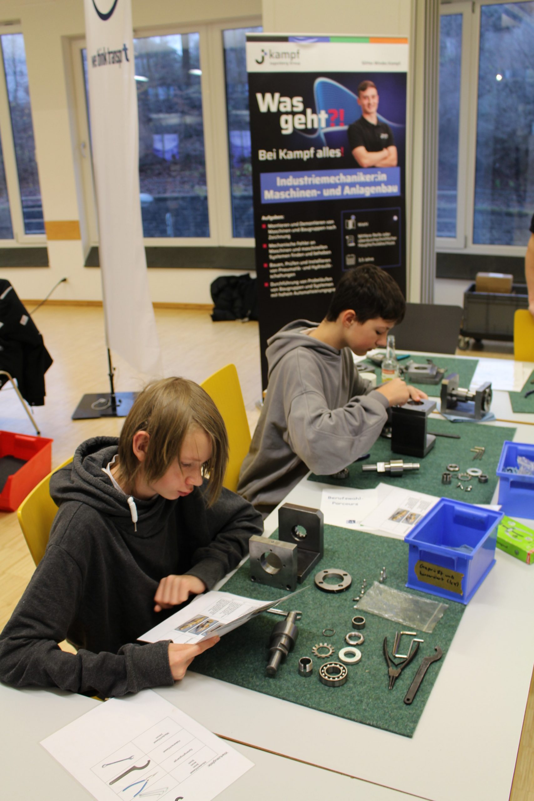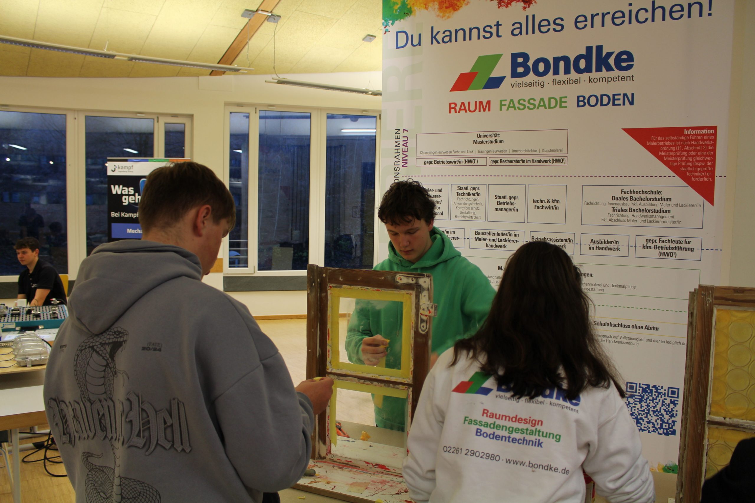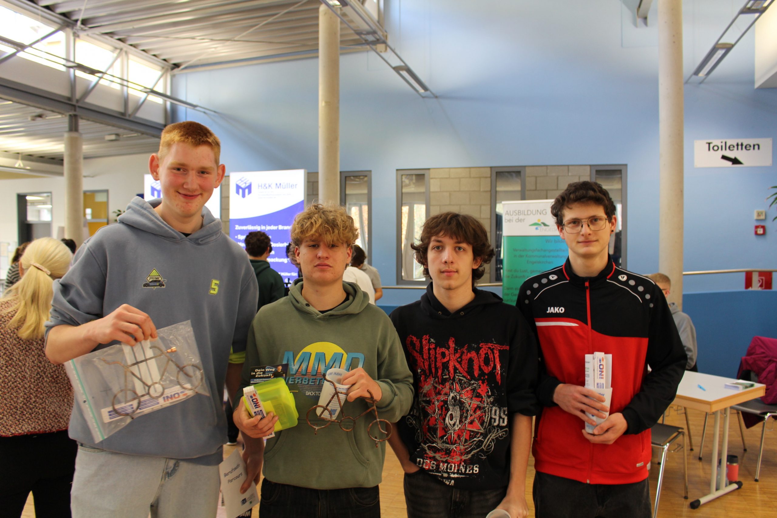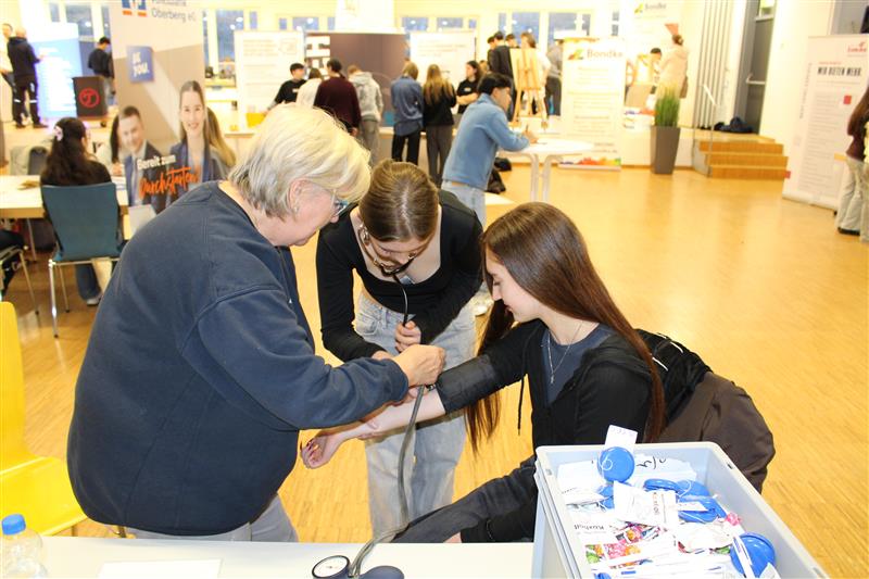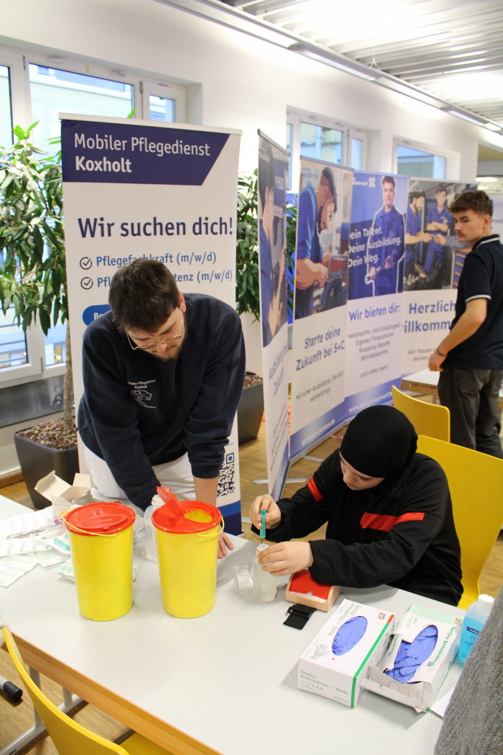 Am Dienstag zischte und hämmerte es in unserer Mensa. Zwölf Betriebe, z.B. aus der Gemeinde H&K Müller und Lukas Erzett und aus der Region, z.B. ONI, Schmidt&Clemens, Volksbank Oberberg, OVAG hatten interessante Stationen vorbereitet, die unsere Schülerinnen und Schüler durchlaufen konnten.
