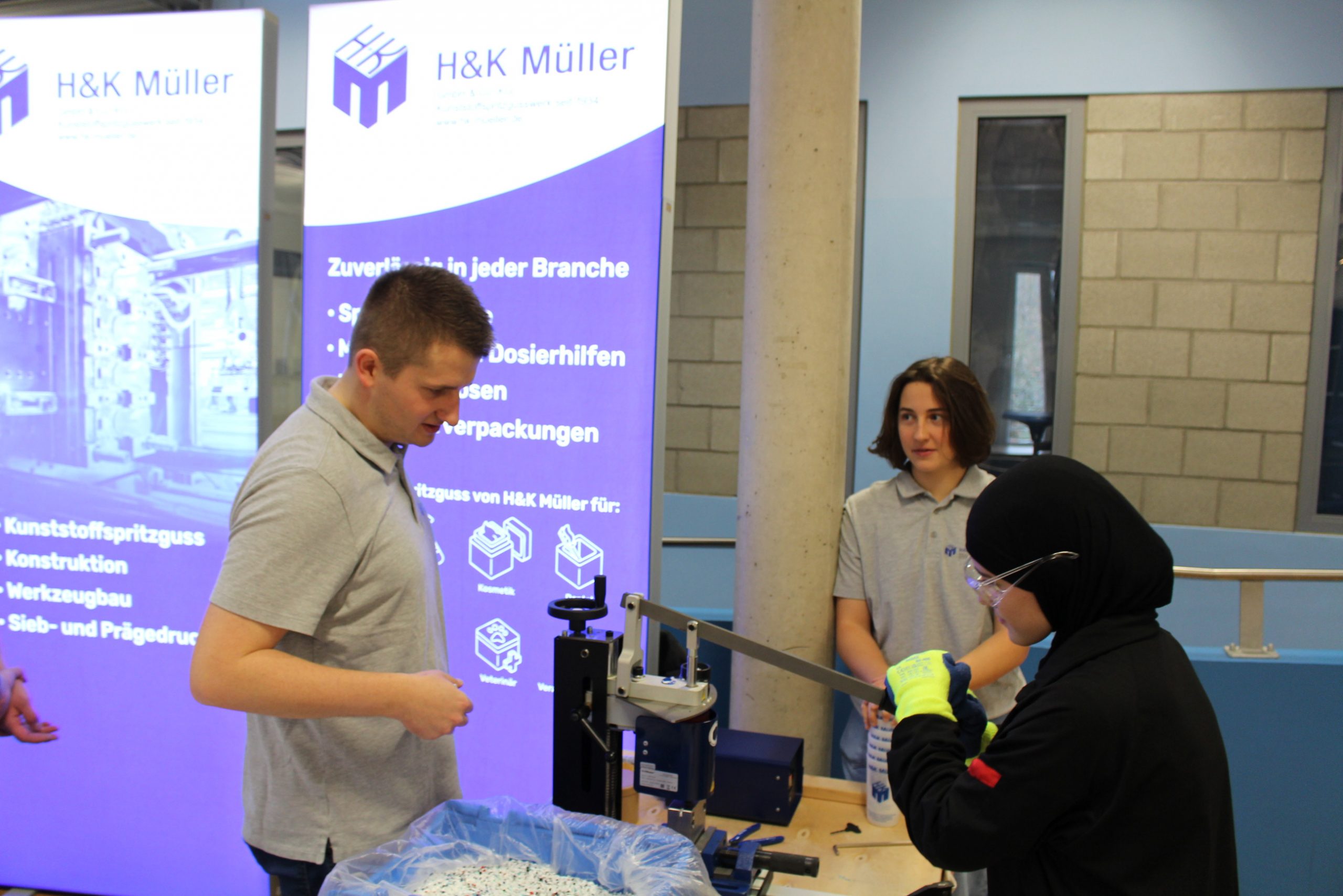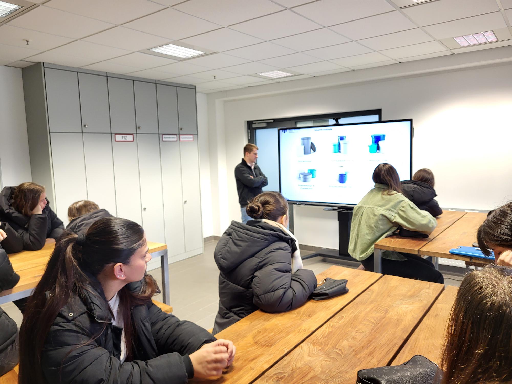 Die Betriebsbesichtigung bei H&K Müller begann mit einem Vortag über die Firmengeschichte, die Produkte der Firma und welche Berufe bei H&K Müller ausgebildet werden. H&K Müller stellt z.B. Aufbewahrungsdosen mit verschiedenen Verschlüssen für Kosmetik und Lebensmittel her.