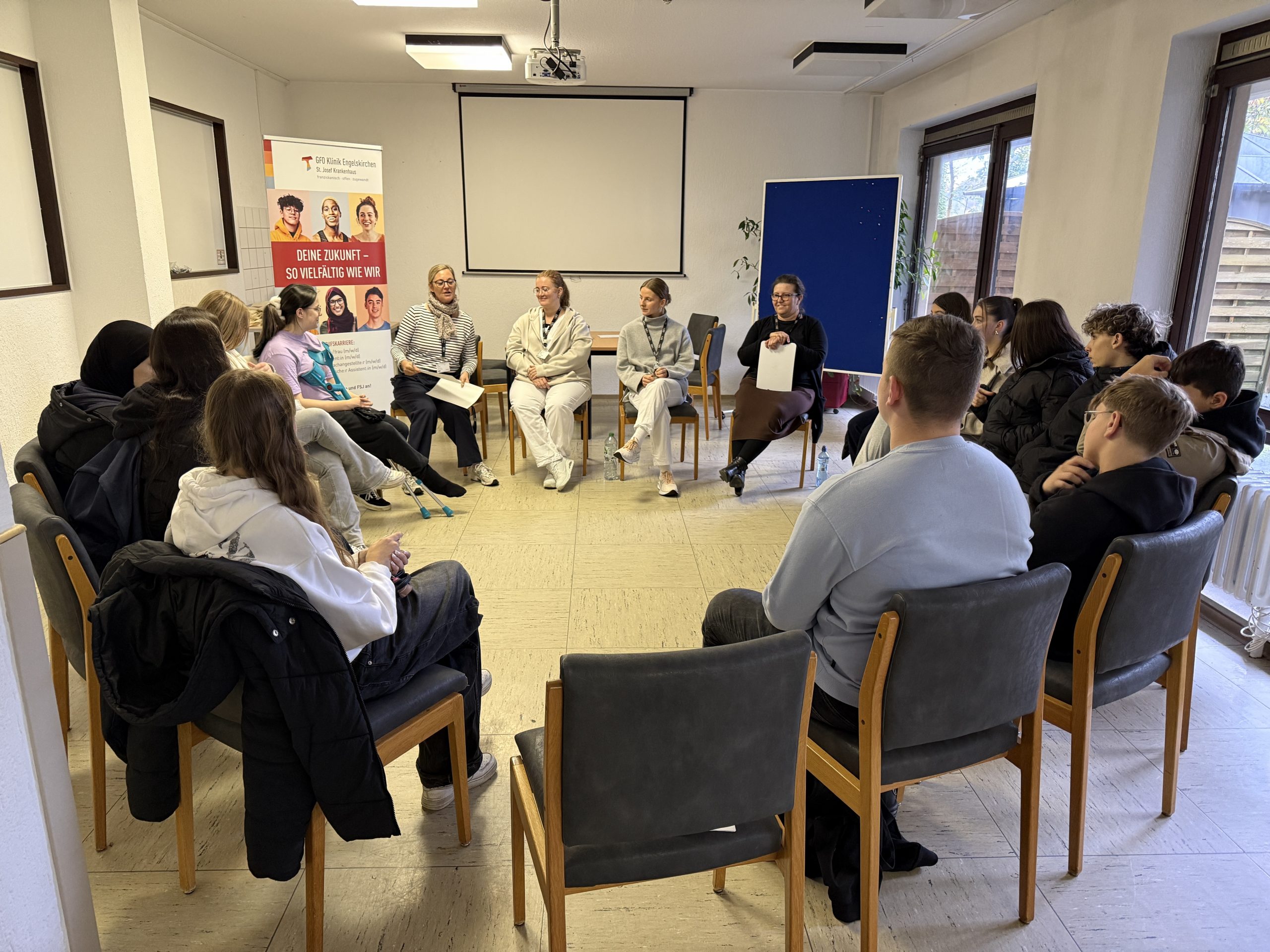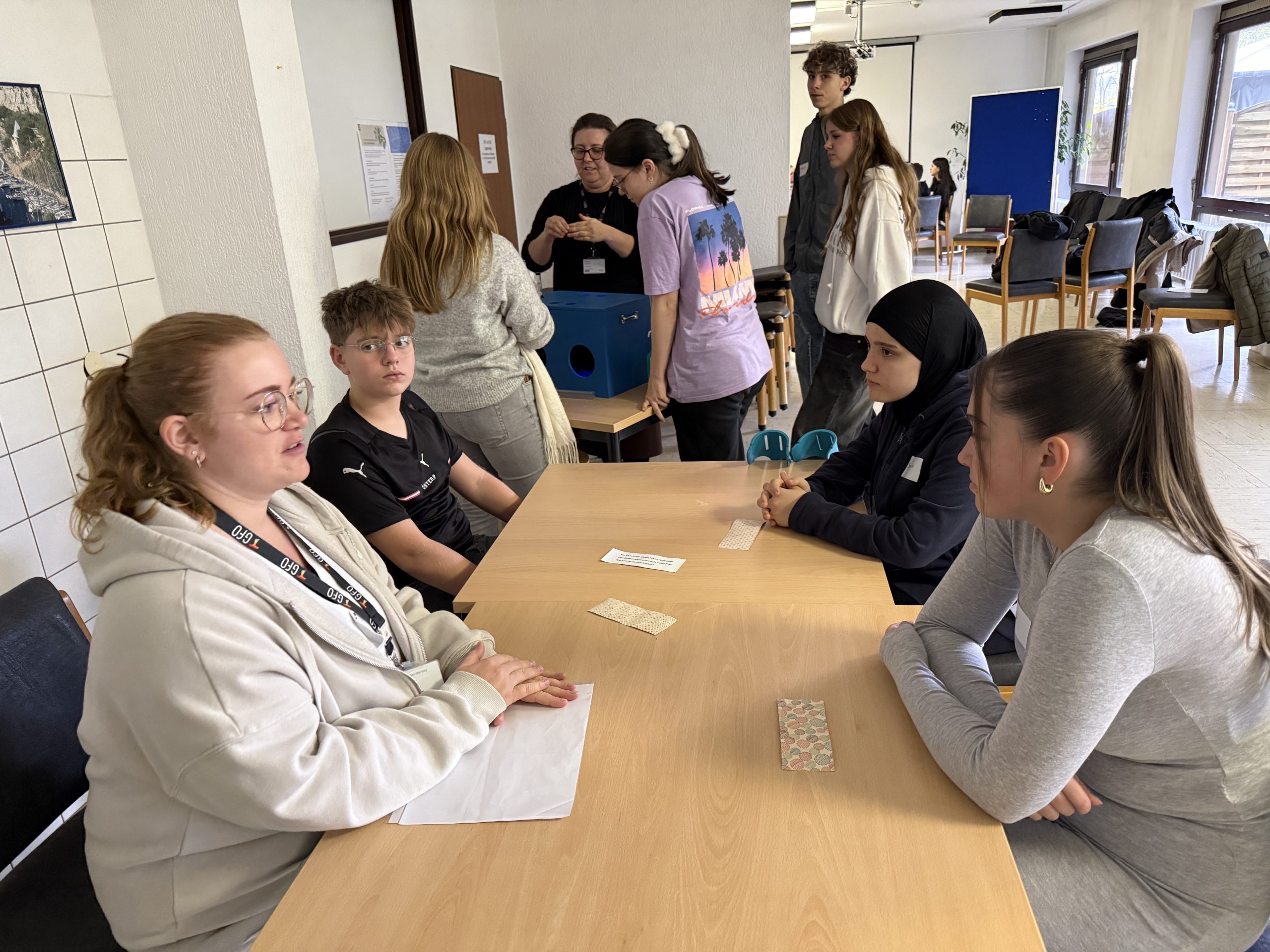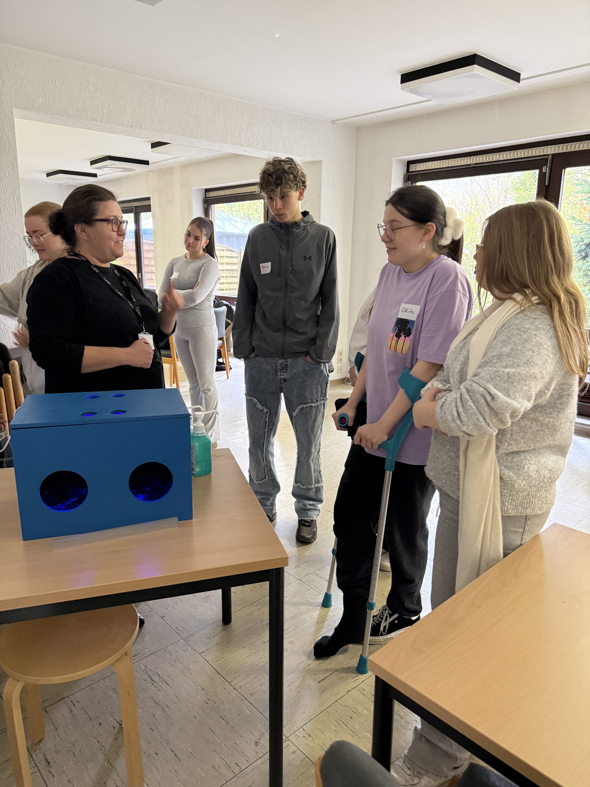 Im Krankenhaus Engelskirchen konnten unsere Schüler an vier Workshops teilnehmen. Vorher gab es einige Informationen über die Berufsbilder und Möglichkeiten nach der Ausbildung. Die Station mit Desinfektion war für alle sehr überraschend. Das Licht in der Box zeigte sehr viele dunklen Stellen an der Hand, die mit der Desinfektion nicht bereinigt wurden. Die Schüler haben aktiv wie am Gespräch so auch an den Stationen teilgenommen.