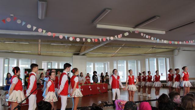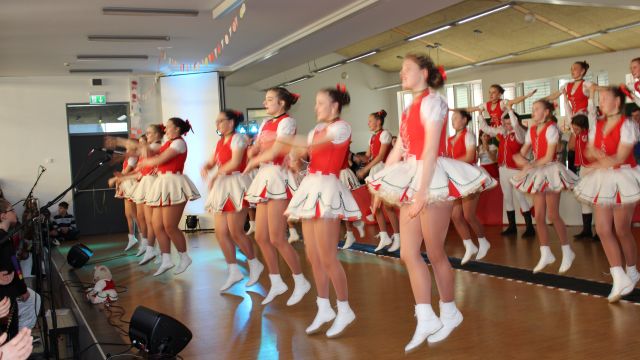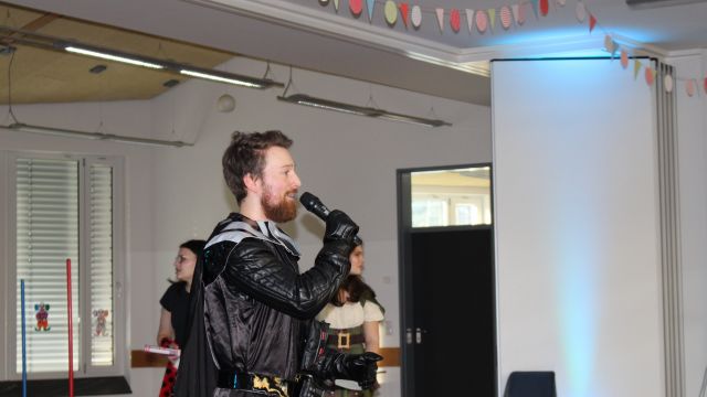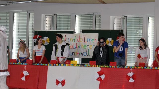 Alle Schülerinnen und Schüler wurden vom Elferrat mit einer Polonaise in ihren Klassen abgeholt und in die bunt geschmückte Mensa geführt. Dort wurde ein abwechslungsreiches Bühnenprogramm geboten, bei dem Schüler und Lehrer gegeneinander antraten. Das Highlight bildete der Auftritt der Jugendtanzgruppe KG Närrische Oberberger.
