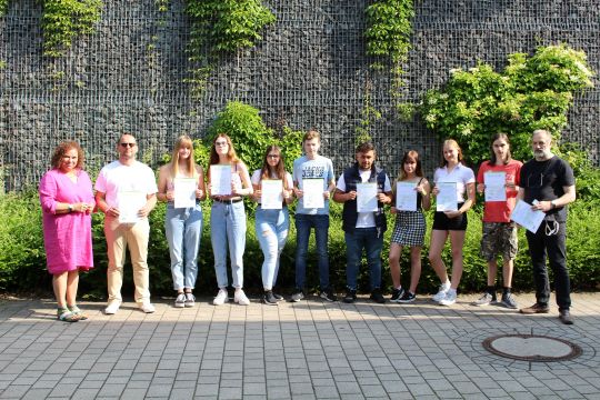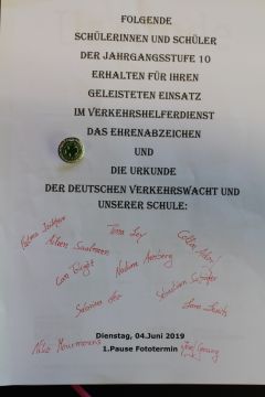 Vor zwei Jahren, durch die Polizei zu Verkehrshelfern ausgebildet, versahen die mit Ehrennadel und Urkunde ausgezeichneten Schülerinnen und Schüler bei Wind und Wetter ihren freiwilligen Lotsendienst. Schulleiterin Frau Lengen-Mertel und die beiden betreuenden Lehrer Herr Mourmouris und Herr Gerwing dankten den 10er Schülerinnen und Schüler für ihren tollen Einsatz.