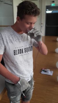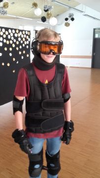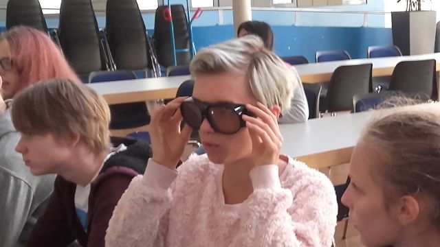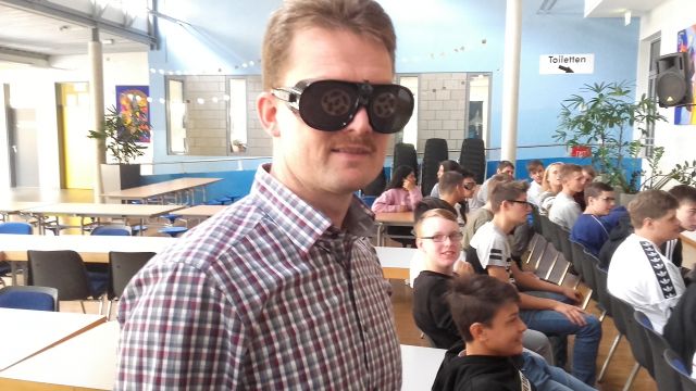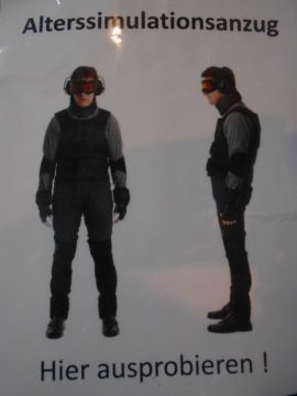 Ausprobiert wurden dann ein Alterssimulationsanzug, Handschuhe, mit denen man die Parkinsonkrankheit (Schüttellähmung) nachempfinden konnte und einige Spezialbrillen, die vornehmlich im Alter auftretende Sehschwächen simulierten. Selbst Herr Warkentin, einer der Klassenlehrer unserer neuner Schüler, ließ es sich nicht nehmen, die ein oder andere Brille auszuprobieren. Mit diesen praktischen Übungen sollten sich unsere Schülerinnen und Schüler besser in altersbedingte Lebenssituationen einfühlen können.