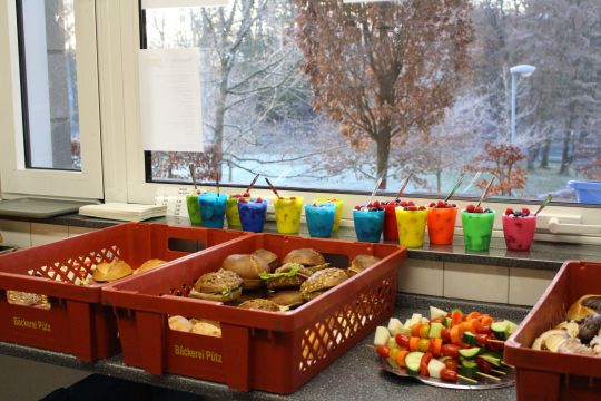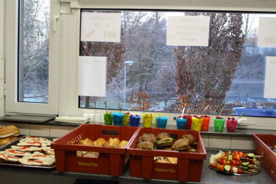 Ein reichhaltiges Angebot gibt es in den beiden großen Frühstückspausen für unsere Schülerinnen und Schüler. Ob belegte Laugenstangen, Brötchen, Schokobrötchen, Gemüsespieße oder Obstbecher mit Joghurt bzw. Müsli – es gibt eine große, vitaminreiche Auswahl, die mit Liebe vorbereitet wird. Für jeden Geschmack ist etwas dabei. So können die Schülerinnen und Schüler gestärkt in den Unterricht gehen.