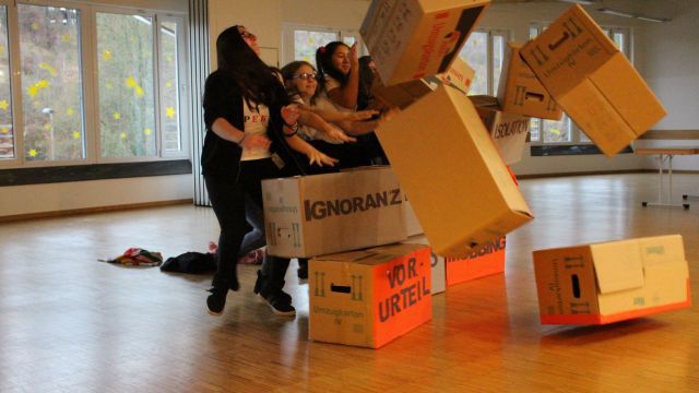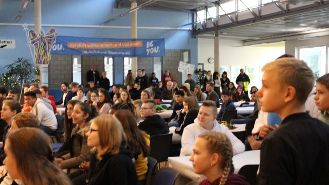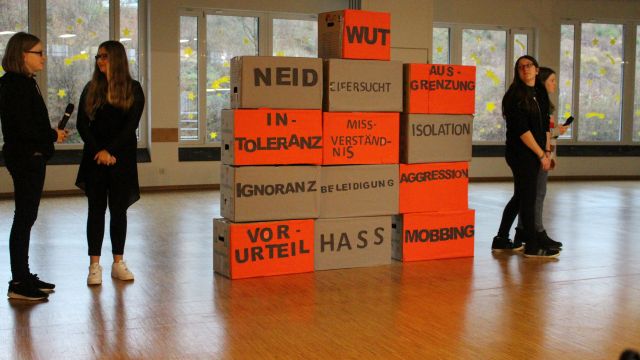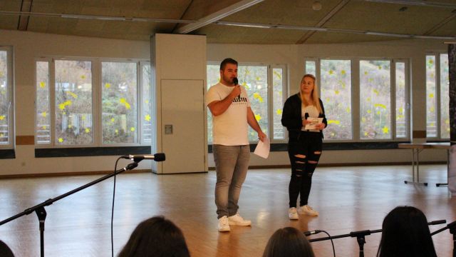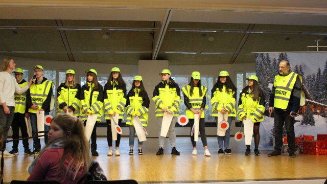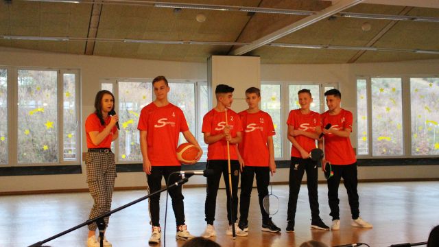 Es folgte ein buntes Bühnenprogramm, durch das die Schülersprecher Angelina und Danilo führten, bei dem sich die Verkehrshelfer, die Streitschlichter oder die Sporthelfer vorstellten. Auch der Kurs des Jahrgangs 7 aus dem Fach Darstellen und Gestalten trug zu dem unterhaltsamen Programm bei, indem sie sich zu laut schallender Musik wie Roboter über die Bühne bewegten.