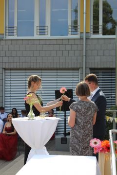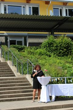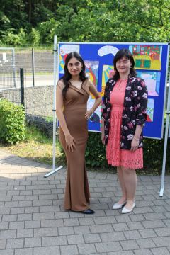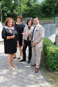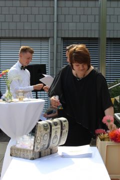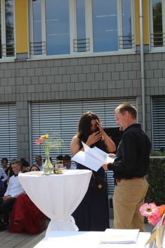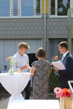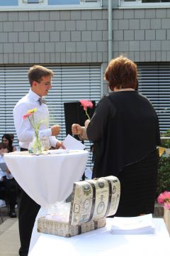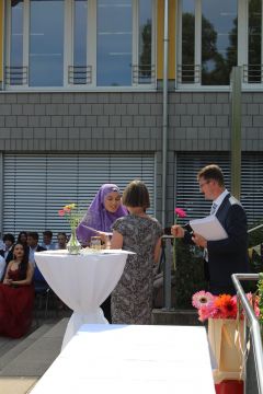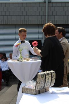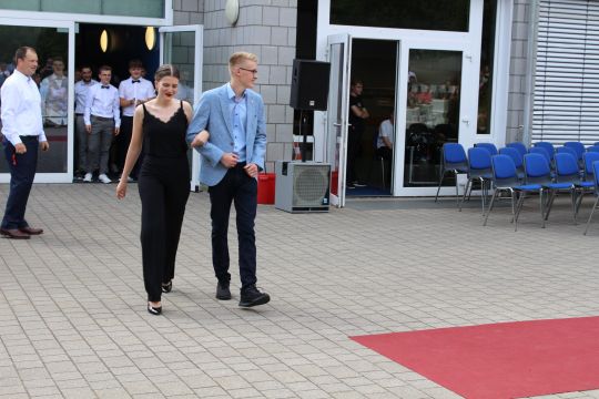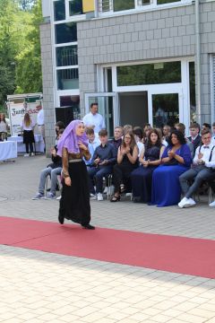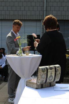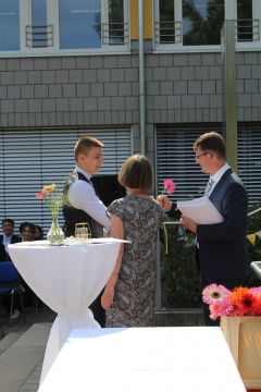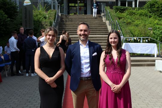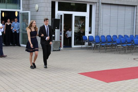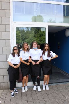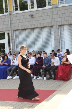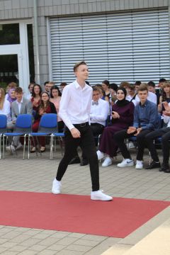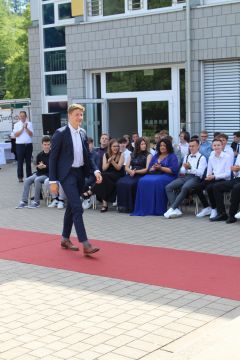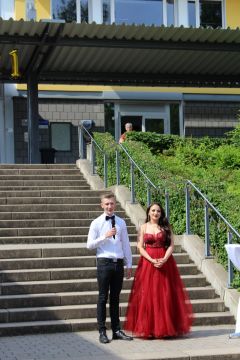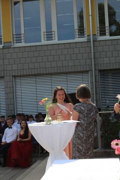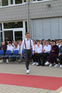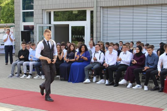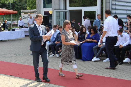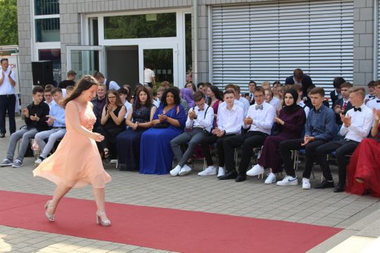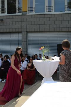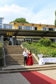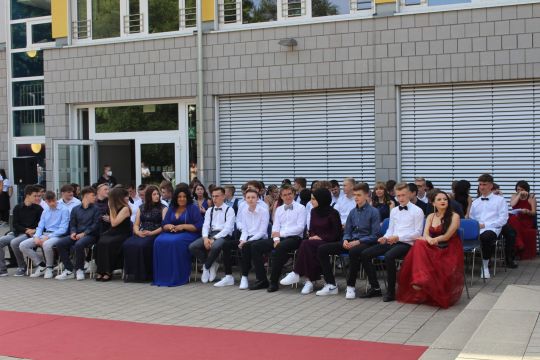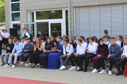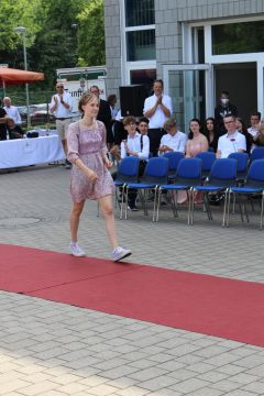 Für die feierliche Zeugnisübergabe verwandelte sich der Schulhof in einen sonnigen Festsaal. Unter tosendem Applaus schritten unsere festlich gekleideten 10er über einen roten Teppich, um vor dem Haupteingang ihr Abschlusszeugnis verliehen zu bekommen. Wie Frau Lengen-Mertel in ihrer Rede bereits betonte, verabschieden wir hier einen Jahrgang, der in einer Ausnahmesituation einen kühlen Kopf bewahrte und allen Umständen zum Trotz das große Ziel – Abschluss 2021 – nie aus den Augen verlor. Gerade in diesen Zeiten der Improvisation freuen uns umso mehr, dass circa ein Drittel sogar die Fachoberschulreife mit Qualifikation zum Besuch einer gymnasialen Oberstufe erreicht hat.