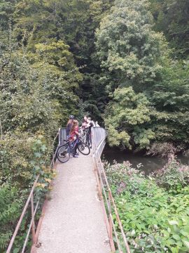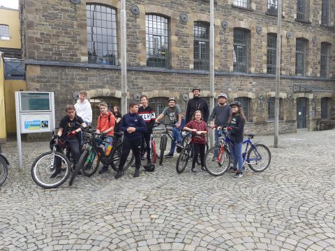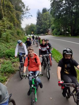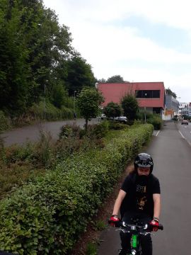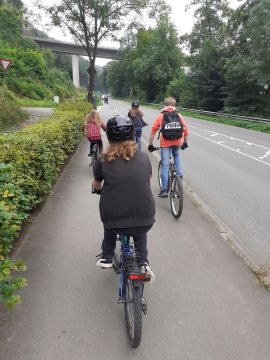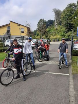 Ein voller Erfolg war auch die gemeinsame Fahrradtour durch Engelskirchen. An diesem Tag war der Zusammenhalt besonders spürbar. Zu Beginn fuhr die Kolonne durch Ründeroth und zog die verwunderten, aber durchaus wohlwollenden Blicke der Passanten auf sich. Danach ging es Richtung Engelskirchen, wo eine Verschnaufpause vor dem Rathaus eingelegt wurde. Die teilnehmenden Schüler*innen machten im Angesicht des Rathauses einige Vorschläge, wie man die Verkehrsbedingungen in Engelskirchen attraktiver machen könnte, sodass mehr Engelskirchener auf das Fahrrad umsteigen – ein wichtiges Thema in Zeiten des Klimawandels! Die Ergebnisse der Diskussion wurden hinterher an die Gemeinde weitergegeben.