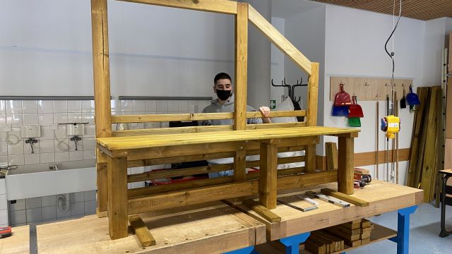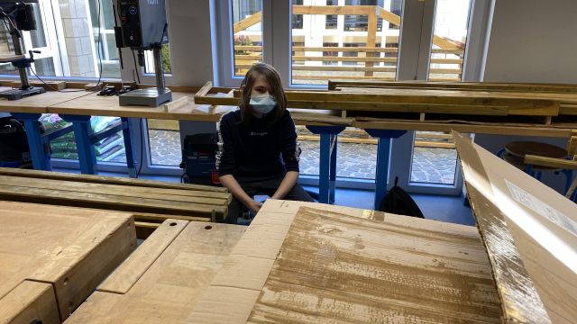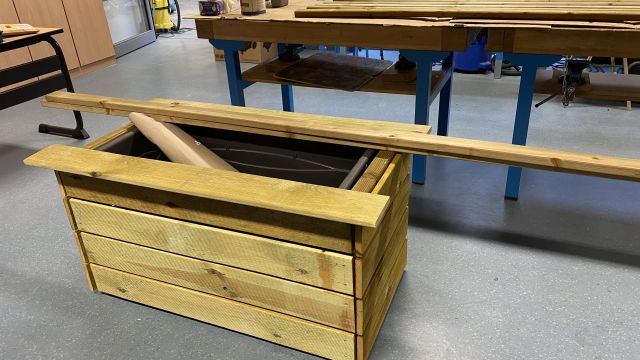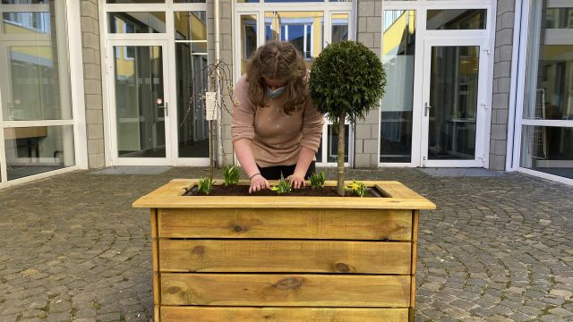 Auch unser Hausmeister, Herr Gosch, wurde mit ins Boot geholt und unterstützte tatkräftig das Projekt, indem er mit anpackte und das notwendige Material, Blumentöpfe, Holz, Schrauben, Farbe, usw. besorgte. Dann wurde es praktisch. Die ersten Ideen wurden in die Tat umgesetzt. So entstanden zunächst Blumenkästen, die von der Hauswirtschaft als „Kräuterkästen“ benutzt werden können.