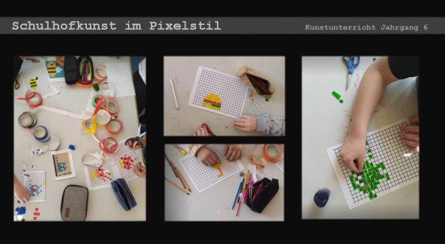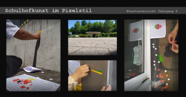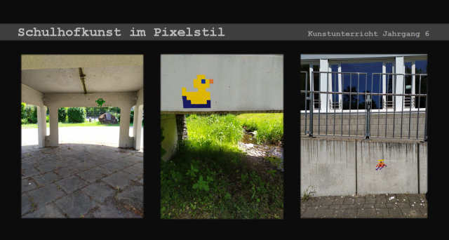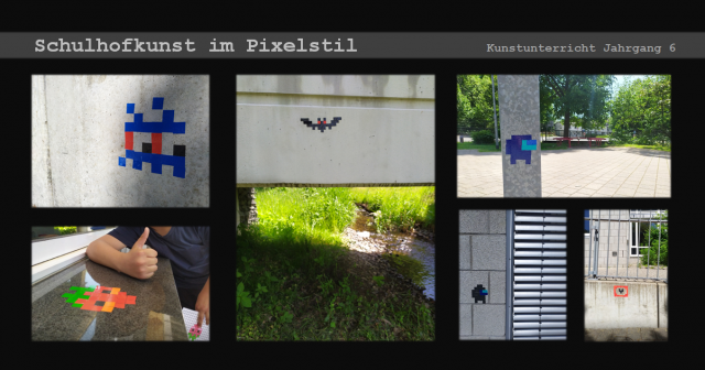 Wer genau hinsieht, entdeckt sie – die kleinen Mosaikbilder auf dem Schulhof der Sekundarschule. Inspiriert durch den französischen Streetartkünstler „Invader“ brachten die Schüler*innen der Klasse 6a im Kunstunterricht verschiedene Motive auf dem Außengelände der Schule an. Die bunten Pixelbilder schmücken nun Fassaden und Stahlträger. Genau hinschauen lohnt sich!