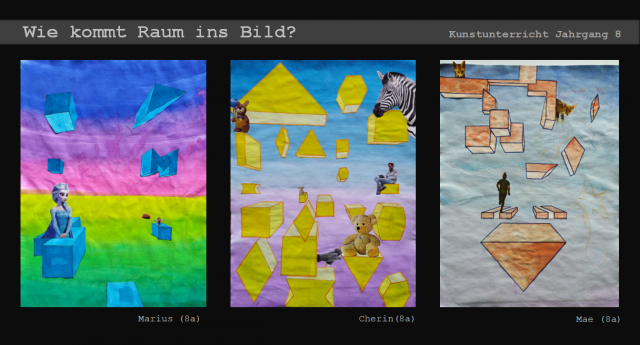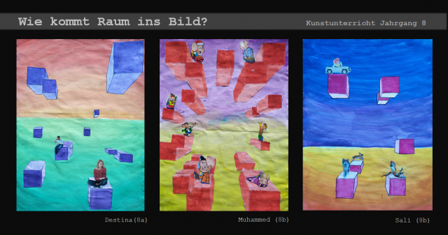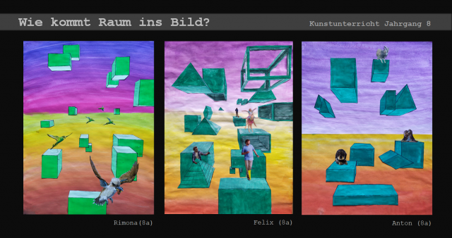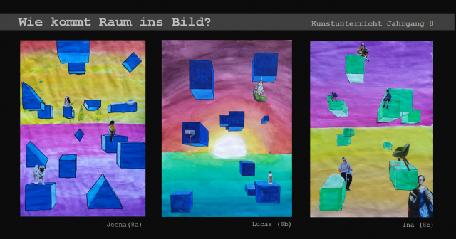 Dieser Frage gingen die Schüler*innen des 8. Jahrgangs im Kunstunterricht nach und eigneten sich in mehreren Schritten verschiedene raumschaffende Mittel und Zeichentechniken an. Bei ihrer praktischen Arbeit kombinierten sie verschiedene künstlerische Techniken und ließen bunte surrealistische Bildwelten entstehen.