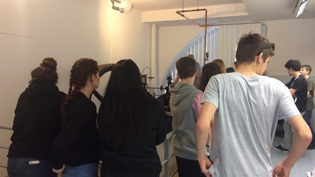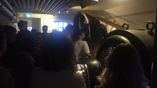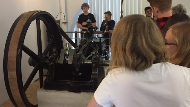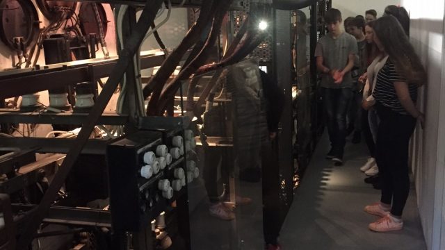 Durch eine Führung durch den Turbinenkeller sowie die Vorführung der Dampfmaschine erhielten die Schülerinnen und Schüler einen lebendigen Eindruck davon, wie die Maschinen in der Fabrik angetrieben wurden und unter welchen Arbeitsbedingungen die Menschen früher arbeiten mussten.