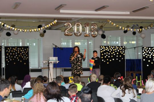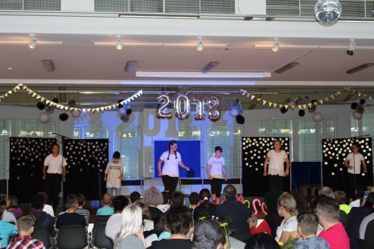 Ein kurzer Film über die Bereiche unserer Schule ermöglichte noch mehr Einblick in den Schulalltag, der auf die neuen 5er zukommen wird. Konkret wurde es bei kleinen Theaterstücken von den jetzigen 5ern, die auf witzige Art und Weise Unterrichtsstunden nachspielten und bereits auf erste Regeln an der neuen Schule hinwiesen. Ein Jumpstyle – Tanz der 6er, Liedvorträge und die abschließende Polonäse quer durch die Mensa, rundeten den abwechslungsreichen ersten Programmteil mit viel Spaß und Freude ab.
