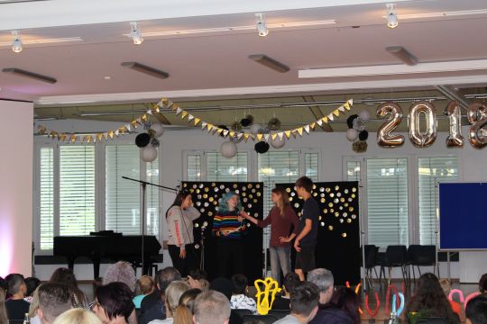 Frau Lengen-Mertel begrüßte die Gäste und gab den neuen 5ern viele gute Wünsche mit auf ihren neuen Weg hier an der Schule. Dazu packte sie symbolisch kleine Gegenstände in eine Schultüte – kleine Figuren, die für die neuen Mitschüler und Lehrer stehen, ein Haus, das das neue Schulgebäude symbolisiert, in dem die neuen Schülerinnen und Schüler bald lernen und sich hoffentlich schnell wohlfühlen werden. Aber auch einen kleinen Ball, der Zeichen für die wohlverdienten Pausen im Ruheraum, auf dem Schulhof oder im Spieleraum sein soll. Auch Stolpersteine werden den neuen Schülerinnen und Schülern begegnen, Unterstützung bei Problemen wird es von Lehrern, Mitschülern und Eltern geben.