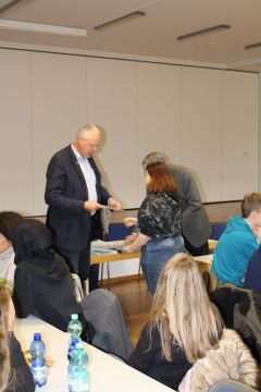 Zertifikatsverleihung des Sozialführerscheins an die Schülerinnen und Schüler der Sekundarschule Engelskirchen durch Dr. Gero Karthaus und Prof. Dr. Wilke.