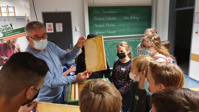 Als Erstes hat der Imker Herr Johannes Schuster aus Loope uns etwas über Honigbienen und seine Arbeit erklärt.