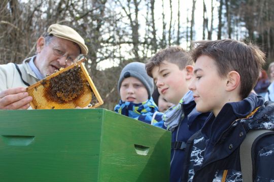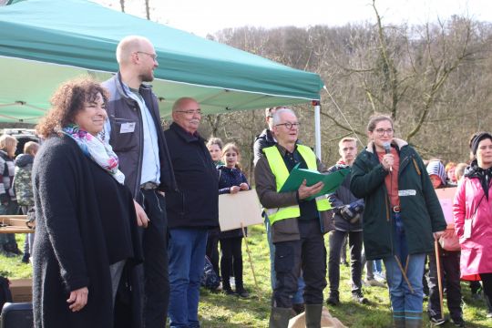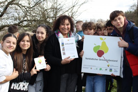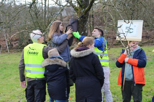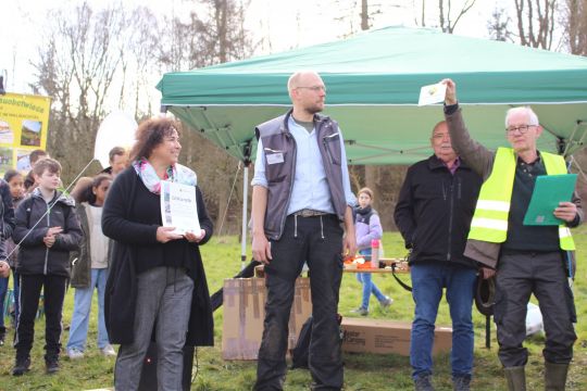 Diese Arbeit wurde am Freitag, den 24. März durch den Landesverband des NABU NRW gewürdigt, indem er uns dem bundesweit einmaligen Projekt den Preis „Vorbildlicher Streuobstbestand“ verlieh. Den Preis nahmen die Schulleiterin Claudia Lengen-Mertel und der Projektleiter Jens Herrmann in Anwesenheit zahlreicher Gäste und Unterstützer des Projekts entgegen. Die Zeremonie fand auf der Streuobstwiese statt und wurde durch vielfältige Mitmachaktionen für unsere Schülerschaft, die durch die Kooperationspartner organisiert wurden, begleitet.