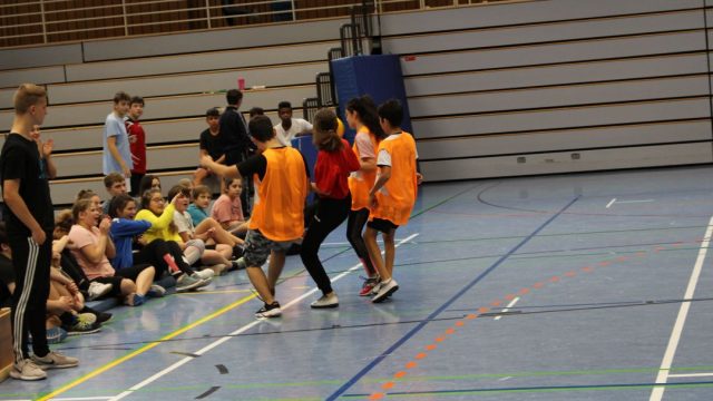 Am Nachmittag maßen die neunten und zehnten Jahrgänge ihre Kräfte. Beachtlich war, dass sich ungefähr 30 Spieler in der Halle einfanden, obwohl die Teilnahme an dem Turnier freiwillig war. Nach einer kurzen Absprache wurden die Teams formiert: Die Klassen 10a und 9c konnten genügend Spieler auftreiben, um ein eigenes Team zu stellen. Zwei weitere Teams wurden durch Zusammenschlüsse der Klassen 9a/9b und 10b/10c gebildet. Ergänzt wurde das Teilnehmerfeld um eine Mannschaft unserer Fußball-AG. Das Turnier lief in sehr entspannter und fairer Atmosphäre ab. So übernahm beispielsweise in jeder Partie ein anderer Schüler die Schiedsrichterrolle. Am Ende des Tages setzte sich die 10bc knapp vor der 9c durch. Die 10a landete auf dem undankbaren dritten Platz.