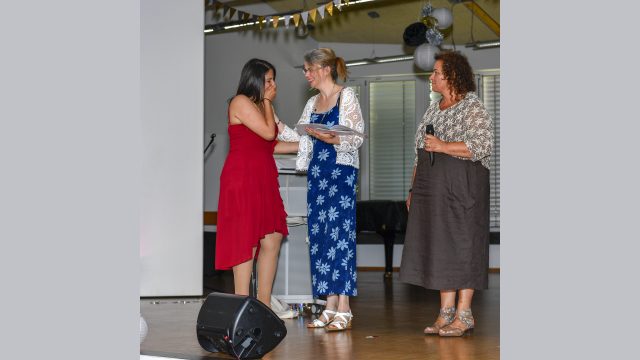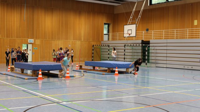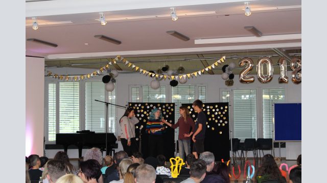 Frau Lengen-Mertel begrüßte die Gäste und gab den neuen 5ern viele gute Wünsche mit auf ihren neuen Weg hier an der Schule. Dazu packte sie symbolisch kleine Gegenstände in eine Schultüte – kleine Figuren, die für die neuen Mitschüler und Lehrer stehen, ein Haus, das das neue Schulgebäude symbolisiert, in dem die neuen Schülerinnen und Schüler bald lernen und sich hoffentlich schnell wohlfühlen werden. Aber auch einen kleinen Ball, der Zeichen für die wohlverdienten Pausen im Ruheraum, auf dem Schulhof oder im Spieleraum sein soll. Auch Stolpersteine werden den neuen Schülerinnen und Schülern begegnen, Unterstützung bei Problemen wird es von Lehrern, Mitschülern und Eltern geben.