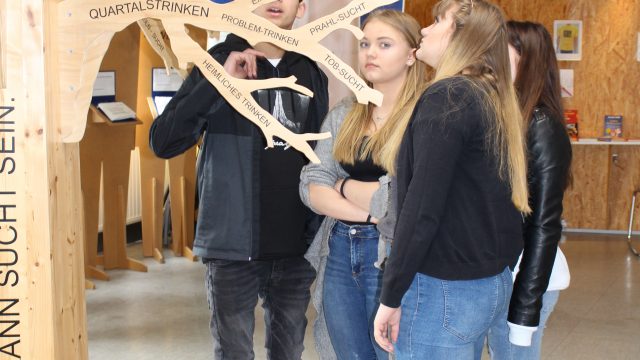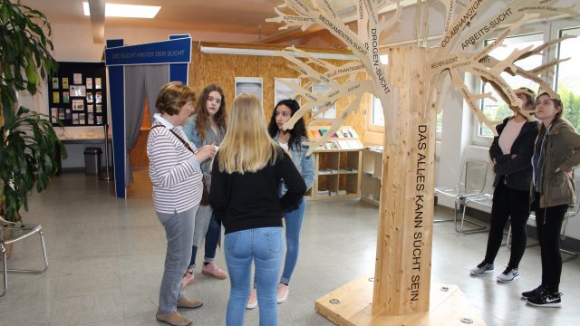 Ein raumhoher Baum regte an sich mit den vielen Erscheinungsformen von Suchterkrankungen auseinanderzusetzen. Andere Stationen zeigten, dass weit mehr Menschen von Süchten betroffen sind als von den Schülerinnen und Schülern bisher angenommen und wie das Denken, Handeln und Fühlen von der Krankheit betroffen wird. Auch der Teufelskreis der Co-Abhängigkeit kam zur Sprache und wie Süchte sich verlagern können und so zu komplexen Systemen einer Mehrfachsucht anwachsen.