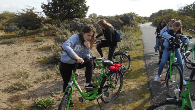 Duinrell ist mehr als ein Freizeitpark mit tropischen Schwimmbad und abenteuerlichen Wasserrutschen, einfachen Selbstversorger-Bungalows und viel platter Landschaft. Duinrell liegt in einer herrlichen Dünenlandschaft und bildet einen natürlichen Schutz der „niedrigen Lande“ vor dem Meer. Knapp eine Woche, 5 Tage, waren wir mit fast 70 Schülerinnen und Schülern, den 10er Klassen unserer Schule, zu Fuß, per Rad, mit Bus und Gracht unterwegs. Die Niederlande sind ein Fahrradland par excellence. So durfte eine ausgedehnte Radtour nicht fehlen. Einen Dünenweg hatten wir uns ausgesucht. Richtung Den Haag. An den Strand und zu einer Miniaturstadt. Wind und Strand waren für viele unserer Schülerinnen und Schüler eine wahre Herausforderung, schäumende Wellen, feinsandiger Strand und Wasser, so weit das Auge reicht.