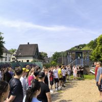 Es war ein tolles Bild, das sich da auf unserem unteren Schulhof ergab. Die Kinder probierten eifrig die verschiedenen Übungen aus und man guckte in strahlende Augen. Jede Klasse hatte einen 90-minütigen Kurs, in dem auch die Gemeinschaft der Klassen gestärkt wurde. In den Pausen drängten sich viele interessierte Schüler an die Abgrenzungen und beobachteten das Geschehen.