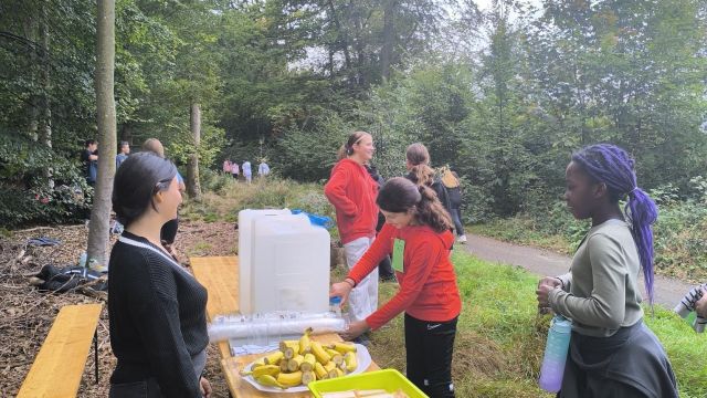 Die Klassen 5 bis 7 legten am Morgen energisch los. Anschließend waren die Klassen 8 bis 10 an der Reihe. Die betreuenden Lehrerinnen und Lehrer unterstützten alle Laufbegeisterten mit Bananen und Müsliriegeln, während sie die jungen Läuferinnen und Läufer lautstark anfeuerten. Auch unser Sporthelfer-Team konnte einen Beitrag leisten: Sie halfen als Streckenposten für den Fall, dass jemand sich verläuft oder verletzt.
